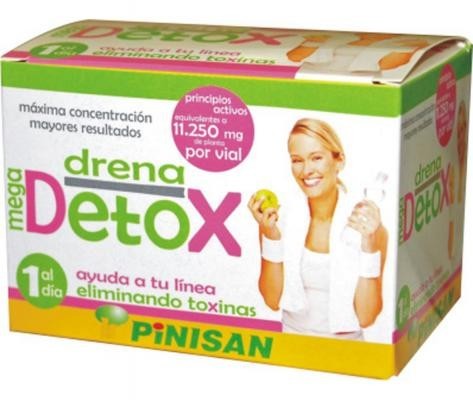 Mega Drena Detox ayuda a tu línea eliminando toxinas. Viales con extractos titulados equivalentes a 11.500 mg de planta medicinal por vial, fructooligosacaridos y fibra de frutas que ayudan a tu línea, eliminando toxinas.