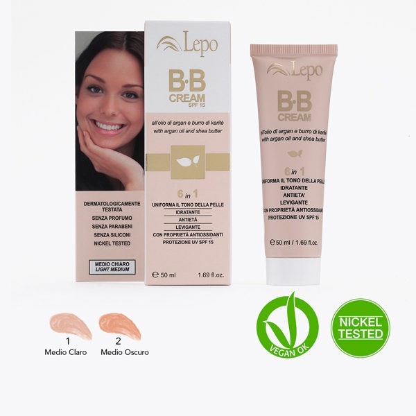 BB Cream al aceite de argán y manteca de karité.Fórmula con múltiples funciones que combina la eficacia de una crema hidratante y el rendimiento del Make-up. Al mismo tiempo hidrata, protege, corrige el tono y uniforma el color de la piel, mejorando visiblemente el aspecto y eliminando todas las manchas. SPF 15.