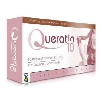 Tegor Queratin 10 ,45 cápsulas es un complemento a base de activos que revitalizan el cabello y las uñas. Contiene extracto acuoso de semillas de calabaza, contra la alopecia androgénica; aporta azufre con MSM y aminoácidos azufrados (cisteína y metionina) para favorecer la síntesis de queratina; con bambú tabashir, fuente de silicio que fortalece el pelo y las uñas; y zinc, para evitar su déficit que se relaciona con la alopecia.