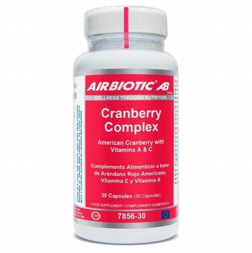 Airbiotic Cranberry Complex 30 cápsulas El uso como complemento alimenticio del arándano rojo americano (cranberry o Vaccinium macrocarpon) está ampliamente extendido a nivel global, especialmente entre las mujeres. Existen muchos productos a base de zumo de esta baya aunque, debido a su sabor ácido, éstos suelen contener cantidades importantes de azúcar para disimularlo. Cranberry Complex de Airbiotic® se presenta en cápsulas para evitar este problema.